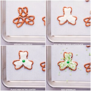 - PREP: Line a rimmed baking sheet with parchment paper and arrange pretzel twists in the shape of a shamrock. In this post, I used three pretzels per Shamrock, but a four-leaf clover could also be fun!