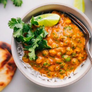 - Remove from heat. Taste and adjust seasoning as necessary. Optionally, mix in cilantro and lime juice and serve over rice with warmed naan on the side and a scoop of raita (see note 3).