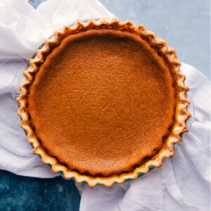 You know this pumpkin pie recipe is done baking by gently shaking the pie in the oven. If it’s done, it will have a slight jiggle or wobble in the center, but won’t be at all liquid-y.