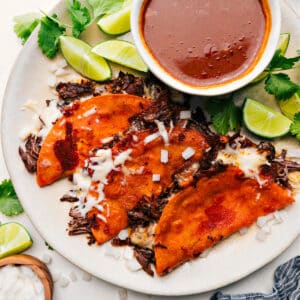 What Are Quesabirria Tacos? Crispy tortillas filled with tender beef and melted cheese, served with a rich dipping broth. The tortillas are dipped in beef juices, then pan-fried until golden and crunchy.