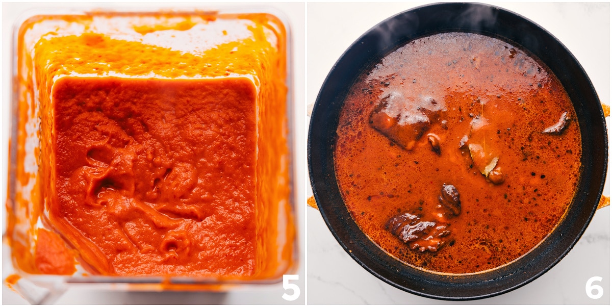 - After 30 minutes, remove the softened chiles, onion, garlic (squeeze out the cloves and discard papery coating), and carrots. Blend with ยฝ cup of broth until smooth (about 2 minutes). Pour the blended sauce back into the pot and stir to combine.