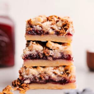 Buttery shortbread on the bottom, gooey raspberry jam in the middle, and a crunchy almond granola topping to finish it off. Theyโre sweet, a little tart, and honestly one of the best desserts Iโve ever made.