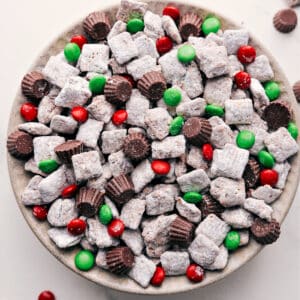 Reindeer Chow is a sweet, crunchy chocolate peanut butter snack mix thatโs easy to throw together and seriously hard to stop snacking on.
