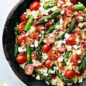 - Halve the cherry tomatoes. Add the tomatoes and asparagus to the large bowl with the couscous. Gently toss. Shake the dressing and drizzle it over the salad to taste. Add another squeeze of fresh lemon juice, if desired. Gently toss again and top with the crumbled feta cheese. Taste and adjust seasoning if needed. Enjoy immediately.
