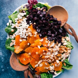 - Add lettuce to a large bowl or platter. Top with the diced cooled beets, citrus, sliced and candied almonds, and goat cheese (see note 2). Drizzle dressing on to your preference; you may not want it all (I use about 3/4 of it. Leftover dressing stays good for up to a week in the fridge and is great on veggies/other salads.) Gently toss to combine, taste for any additional seasoning or if you want to add more dressing, and enjoy immediately.