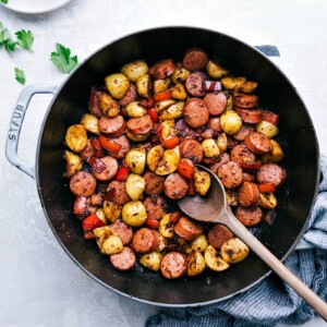 The easiest 20-minute Sausage and Potatoes Skillet dinner! This simple dinner can all be made in one pan and is loaded with flavor!