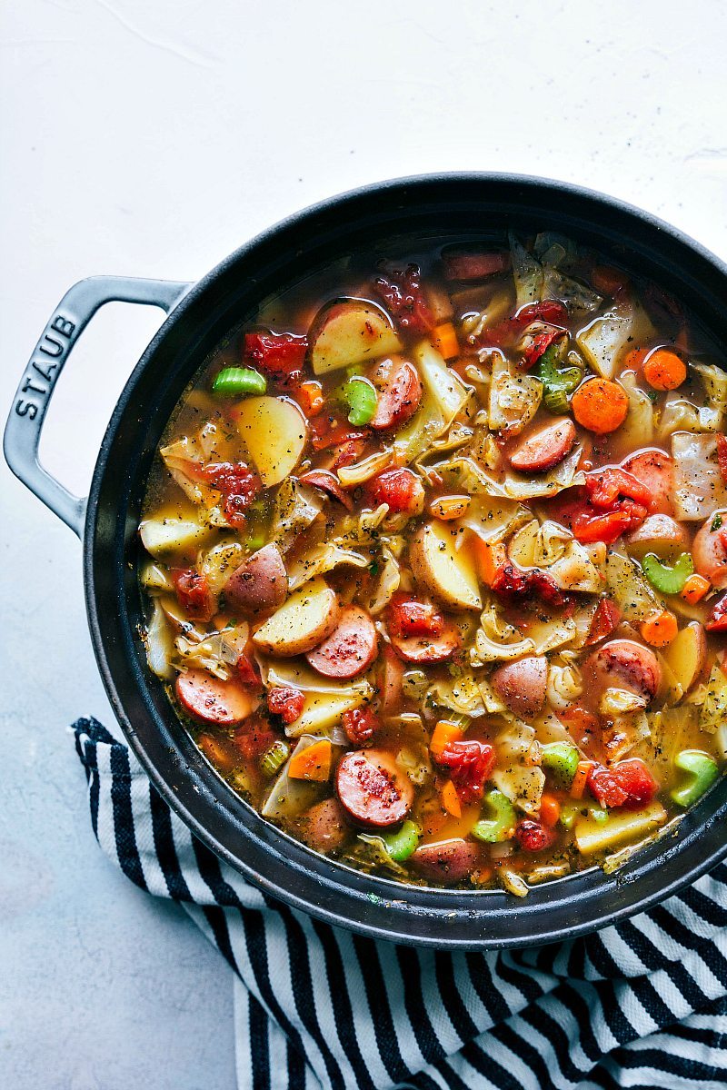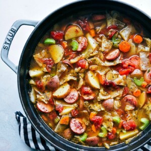 A thick and hearty sausage, potato, and cabbage soup; a healthy recipe that is packed with flavorful ingredients!