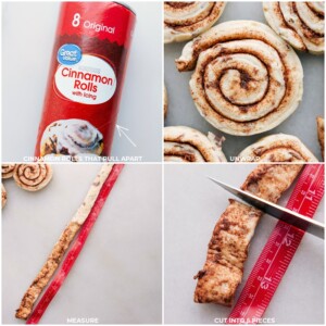 When choosing cinnamon rolls for this recipe, itโs important to pick a package that has dough that can be unrolled. Many packaged cinnamon rolls are circular and donโt unroll at all.