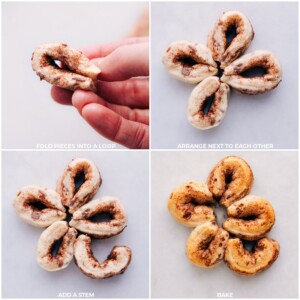 All you need to do is carefully unroll each individual cinnamon roll, cut them into pieces, and shape them into four-leaf clovers. Then bake according to the package directions.