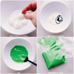 - FROSTING: While the clovers are baking, empty the frosting into a bowl and add food coloring to desired color intensity. Mix together. Transfer the dyed icing to a small plastic bag. Seal it without air and cut off a tiny bit of the tip.