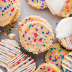 These Slice and Bake Cookies are deliciously buttery and sweet. Theyโre dotted with fun, colorful sprinkles, and if youโre feeling it, drizzled in creamy white chocolate!