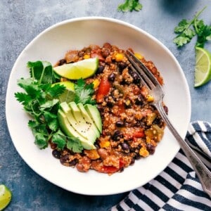 This meal is naturally vegetarian and packed with protein from quinoa and beans. If you want, you can easily stir in some shredded rotisserie chicken once itโs done cooking.