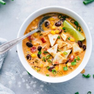- Serve the soup bowls with sour cream, Colby Jack cheese, avocado, fresh lime, cilantro/green onions as desired. If you only do one topping, the cheese is a must! If you don’t serve with the quesadillas, add some tortilla strips to the top.