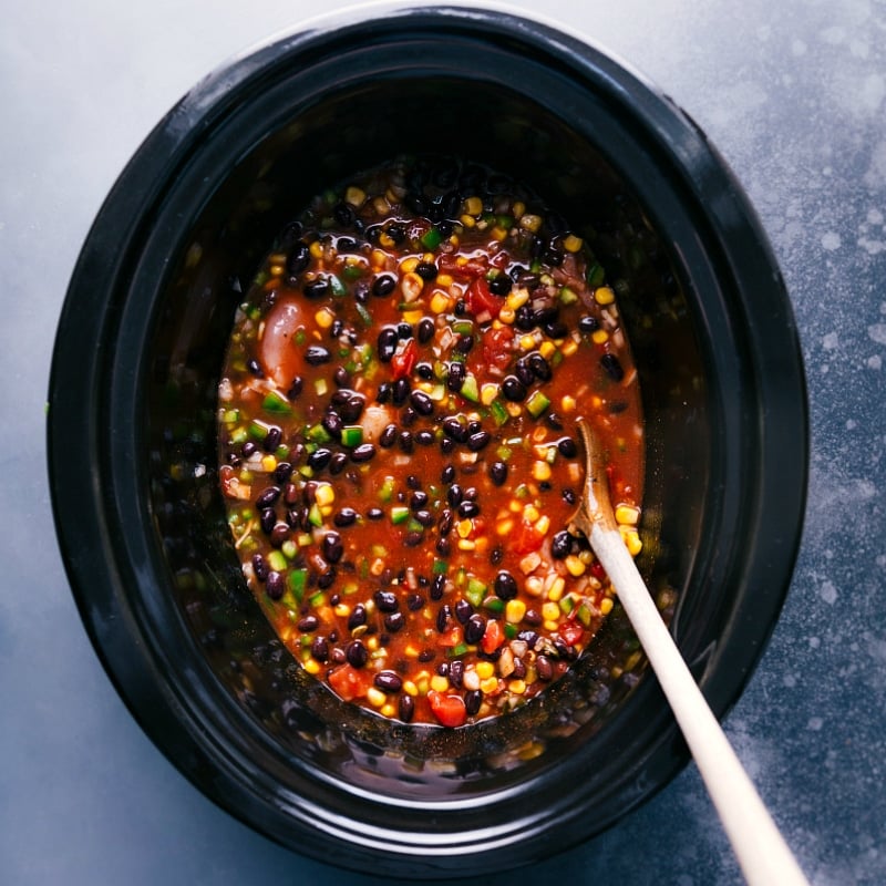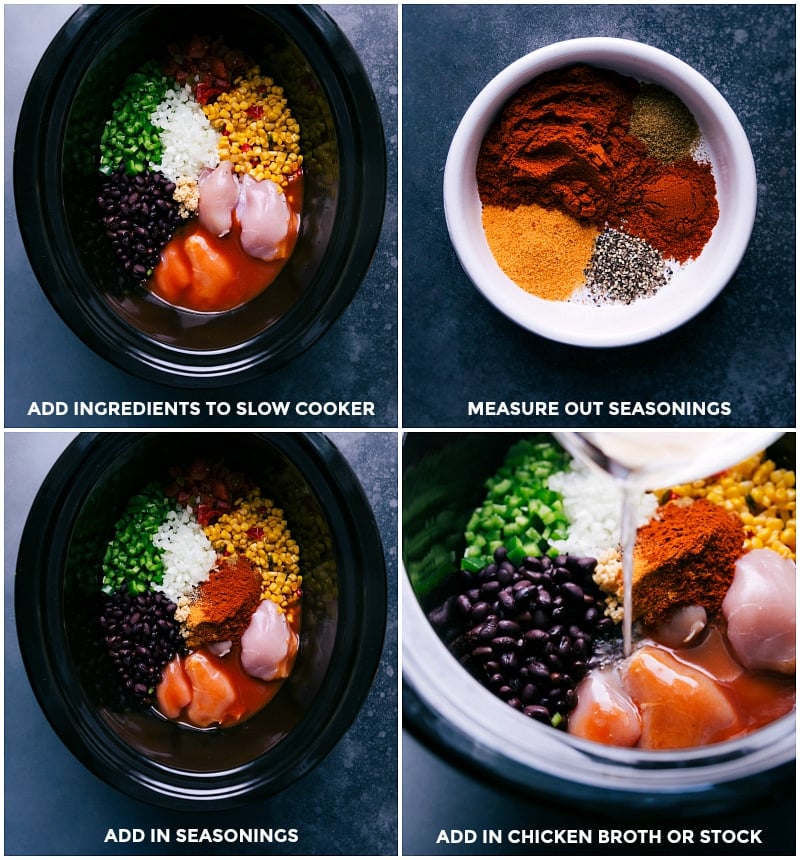 - In a large Crock-Pot (I use a 6-quart one), add the diced green pepper, diced onion, chicken breasts, enchilada sauce, undrained tomatoes, drained and rinsed black beans, undrained corn, chicken stock, and minced garlic.