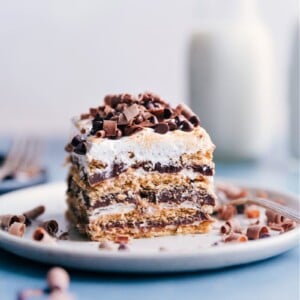 This Sโmores Icebox Cake features layers of rich chocolate ganache, fluffy marshmallow cream, and honey graham crackers. No baking required!