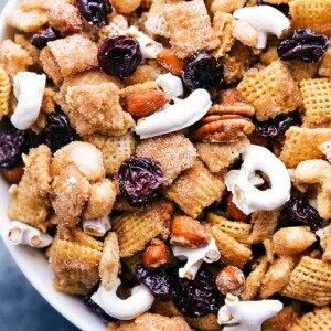 This addicting Dried Cherry Snack Mix is loaded with cereal, nuts, dried tart cherries, yogurt-covered pretzels, and covered in a cinnamon-sugar coating.ย