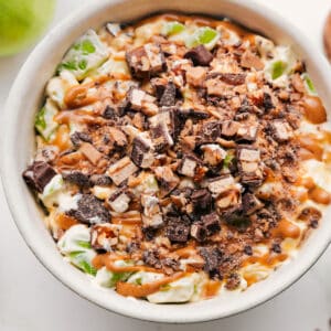 To finish off this Snickers Salad, I love adding a few toppings. These are optional, but they make the treat look and taste even better!