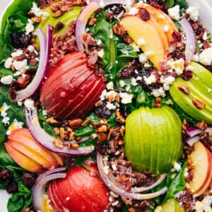 Spinach Salad Recipe with crisp apples, tangy red onion, sweet cranberries, creamy feta, crunchy bacon, and candied pecans, tossed in a delicious apple-Dijon dressing.