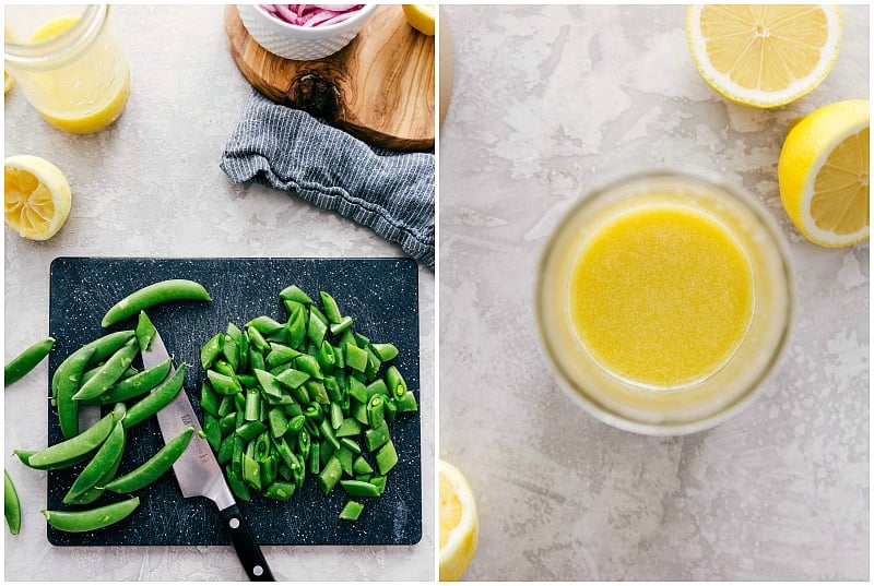 - Combine diced red onion, red wine vinegar, and 1 teaspoon sea salt in a small bowl. Set aside and stir occasionally.ย Cook quinoa according to package directions and allow to cool completely. (Refrigerate to hurry it along if needed). Slice sugar snap peas, chop fresh basil, and set aside.
