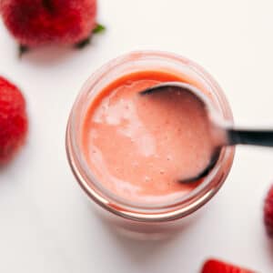 This Strawberry Vinaigrette Recipe is tangy, sweet, and full of flavor! It’s perfect on a fresh salad with berries, peaches, candied nuts, and creamy cheese.