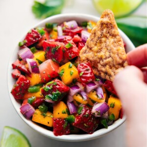 Strawberry Mango Salsa takes simple ingredients like mango, strawberry, lime, honey, and jalapeรฑo and turns them into the ultimate summer snack.
