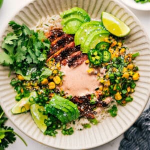 So, of course, I had to turn it into a street corn chicken bowl. And let me tell you, this one delivers. Juicy blackened chicken, charred corn with fresh herbs, and the most delicious chili lime sauce drizzled on top? Itโs unreal. I could eat this bowl over and over again and never get tired of it!