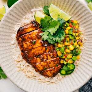 Donโt sleep on the chickenโitโs not just a base for the salsa! The quick marinade (just a few pantry staples) makes it so juicy, tender, and flavorful. Baste it as it grills, and it turns out so good it barely makes it off the cutting board.