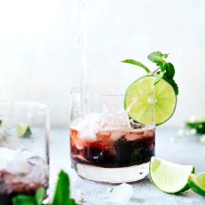 - Add in 1/2 tablespoon tart cherry concentrate, 2 teaspoons sugar, 1 tablespoon fresh lime juice, and 1 tablespoon fresh mint leaves into each glass.