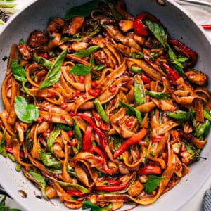 Thai Drunken Noodles Recipe is a simple stir-fry with rice noodles, your choice of protein, crisp veggies, and an incredible, easy sauce inspired by my favorite Thai food truck.