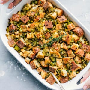 Yes! This Thanksgiving dressing is easy to prep ahead. Dry out the bread and store it in an airtight bag at room temp. Complete step 3, then chill that mixture in an airtight container. The next day, pick up at step 4 and add a little extra bake time if needed.