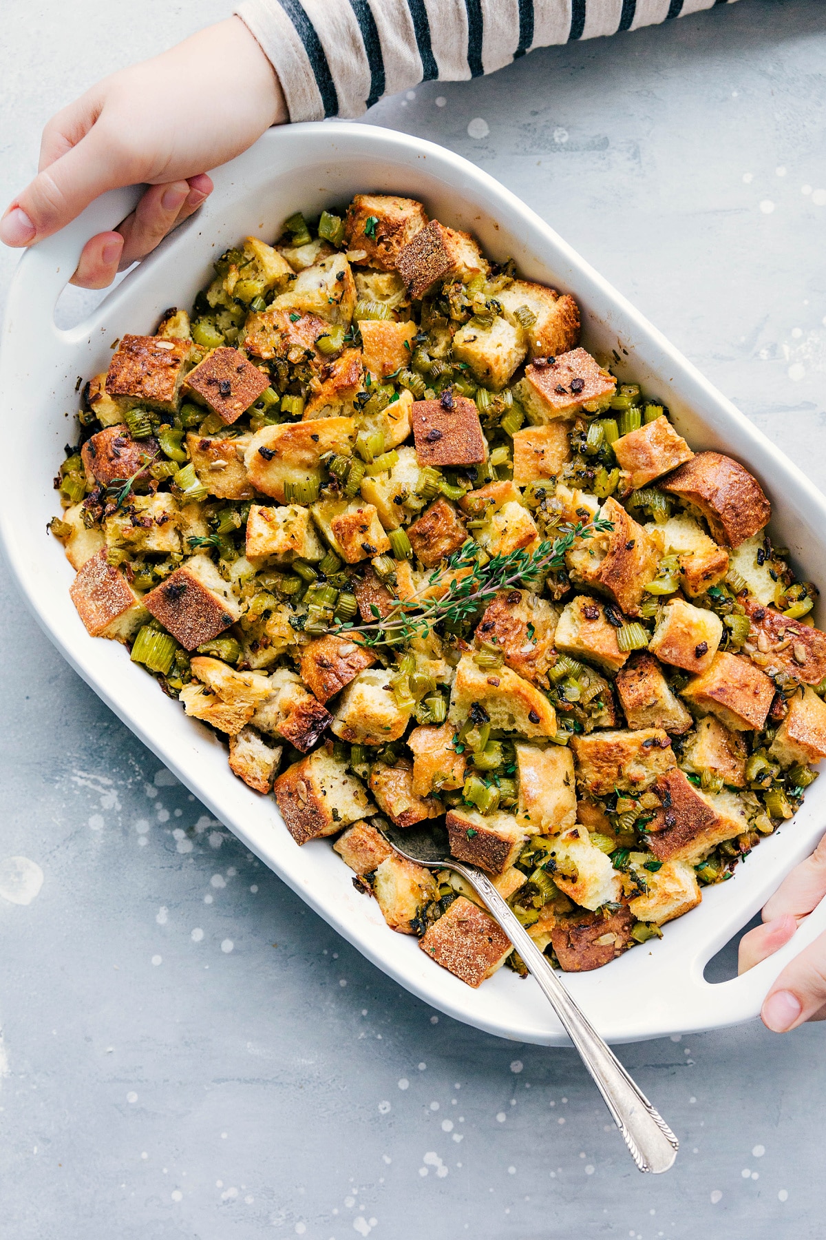 My family’s recipe uses medium-firm bread, fresh herbs, and sourdough. It doesn’t need many ingredients, but the flavor is incredible. It’s always a hit with guests; I can’t show up to Thanksgiving without it!