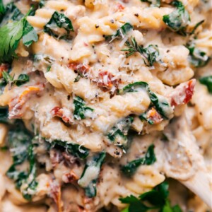 The combo of pasta, sun-dried tomatoes, chicken, and spinach is one Iโll never get tired of. But tossing all those ingredients into one pan and letting the oven do the work? That I really never get tired of. This has quickly become one of my go-to dinner recipes because itโs easy, there are zero complaints, and clean-up is fast.