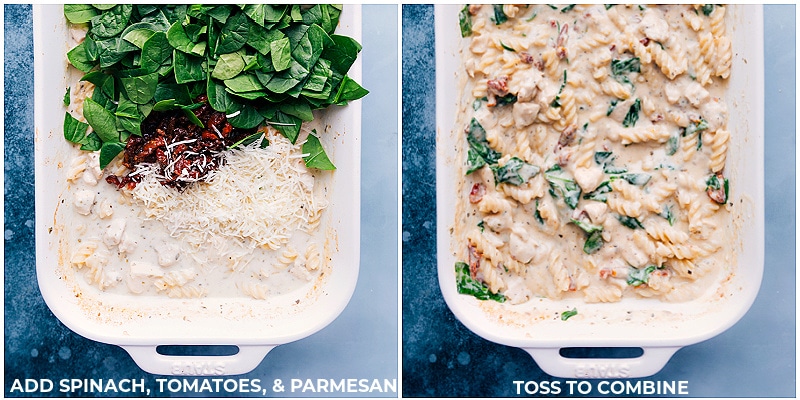 - Remove foil and stir ingredients together well. Add mozzarella and stir through again. Press pasta and chicken below the sauce. Return the pan to the oven, uncovered, and bake another 15 minutes or until pasta is tender (donโt over-bake or sauce will bake out; it should be pretty saucy at this point). Remove from oven and gently stir. Add chopped sun-dried tomatoes, chopped spinach, and a handful (not all) of the Parmesan. Gently stir to combine and wilt the spinach. Continue to mix, gradually adding the rest of the Parmesan while stirring. As you mix, the sauce will continue to thicken. Enjoy immediately garnished with fresh parsley if desired.