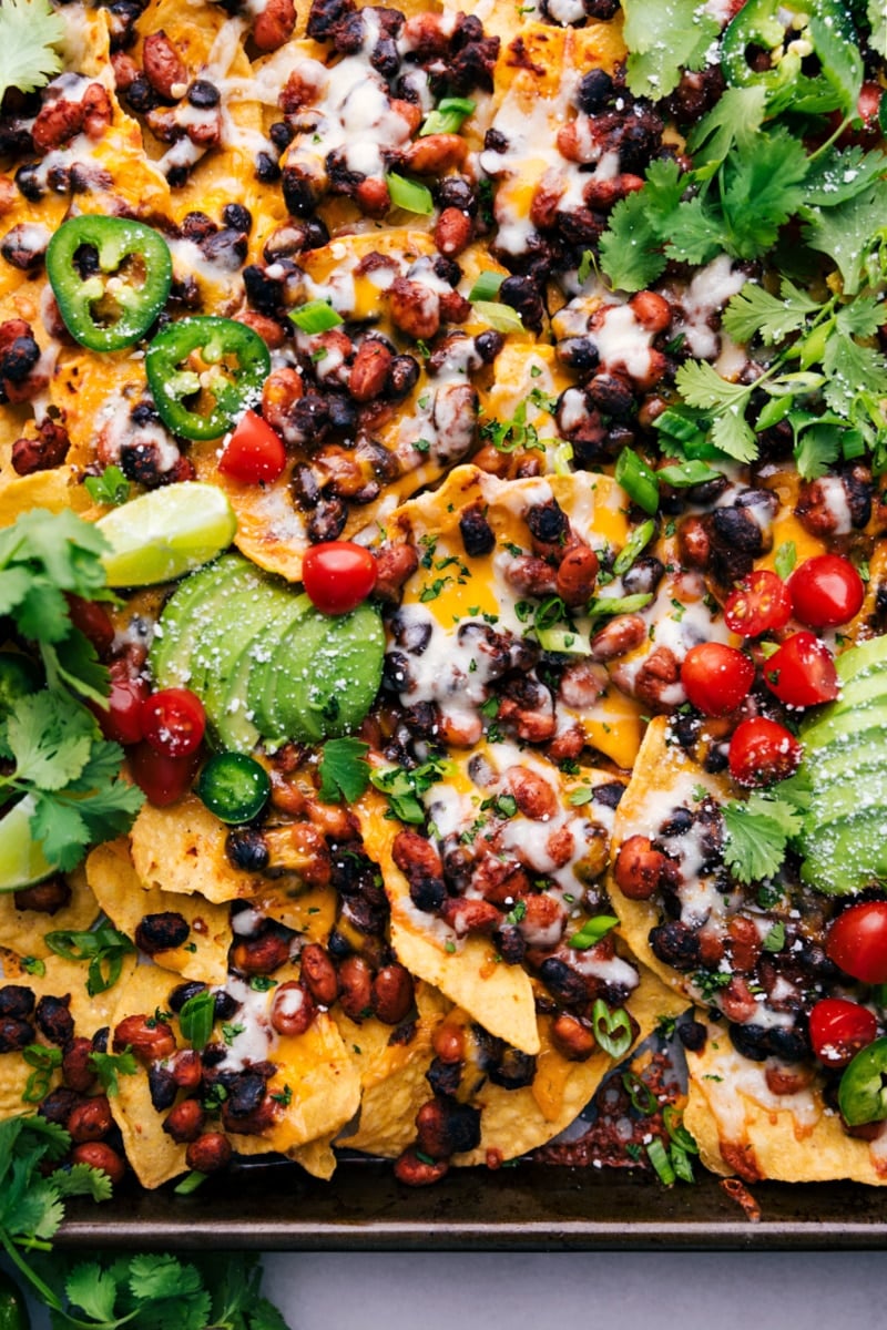These Vegetarian Nachos are the best! Packed with seasoned beans, melty cheese, and fresh toppings, theyโre a hit with everyone, carnivores included!