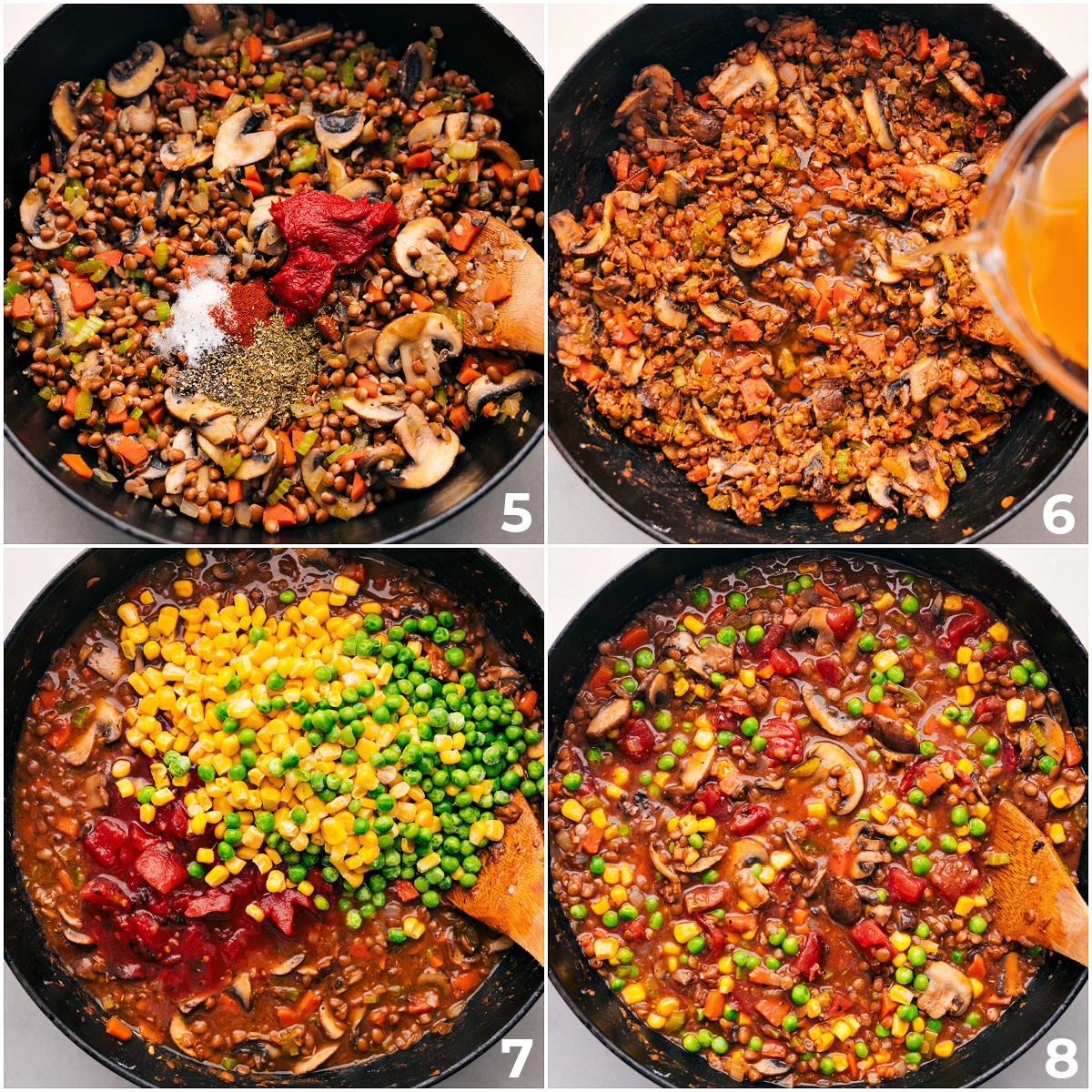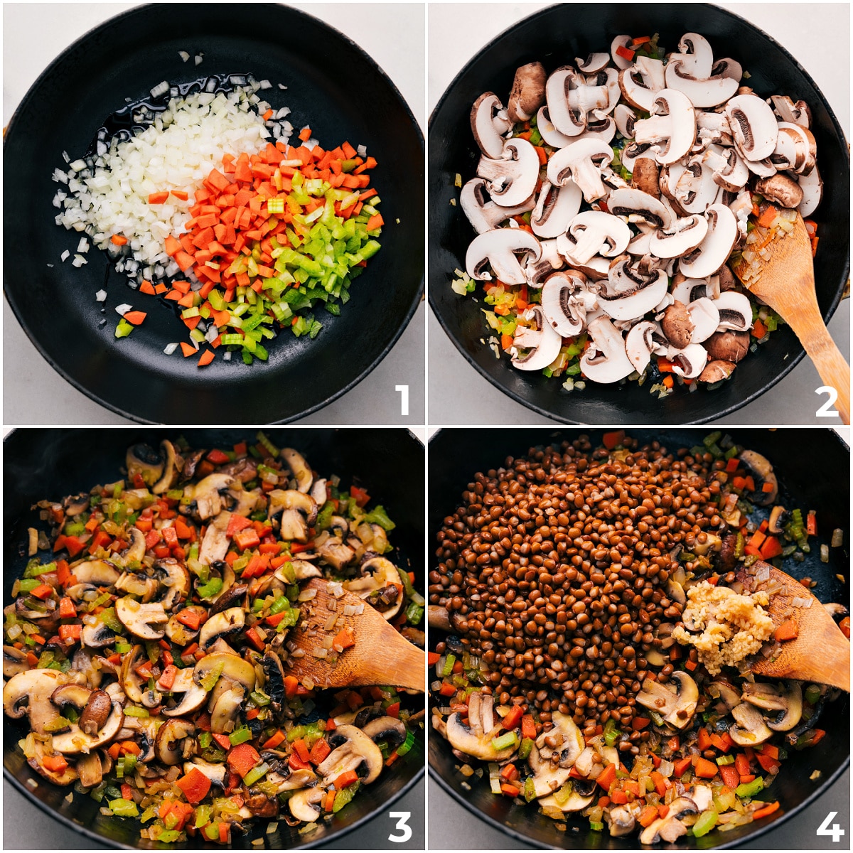 - Cook the Vegetable Base: Sautรฉ onions in olive oil, add garlic, carrots, celery, and mushrooms, and cook until tender, then stir in flour, tomato paste, seasonings, and some vegetable stock.