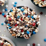 Note 1: Buying pre-popped popcorn speeds things up, but costs more. You can also pop your own using lightly salted plain popcorn. Measure out 8 cups of cooked popcorn. If using plain popcorn, add a bit of salt.Note 2: If you can’t find the red, white, and blue mix, use regular M&M’s and pick out the reds and blues.Note 3: Place popcorn in a large bowl with a cooling rack on top. Turn it upside down and shake over a plate to let the un-popped kernels fall out.Storage: Enjoy fresh within 1–2 days. Store in an airtight container at room temperature. For longer storage, freeze to keep it crisp. It’s tasty right out of the freezer!