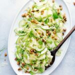 Using a mandolin slicer, thinly slice the fennel bulb. Cut the apples in half and then half again. Remove the core, then thinly slice all the apples with the mandolin. Thinly slice the celery with the mandolin. Add the fennel, apple, and celery to a large bowl.