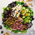 This Arugula Salad Recipe brings together sweet dried figs, savory salami, crunchy cucumber, salty pistachios, and creamy goat cheese for a perfect mix of flavors and textures.