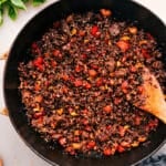 Push the peppers to the edges of the skillet. Increase heat to high and add ground beef to the center, seasoning with a small pinch of salt and pepper. Let the beef brown on one side for about 1 minute, flip, brown the other side, then break it into crumbles. Cook until the beef is fully browned and any liquid in the skillet has evaporated, 5-7 minutes.