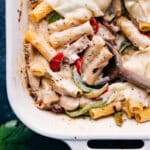 Baked Ziti with Chicken is a creamy, cheesy dish your whole family will love! It’s like a chicken cheesesteak in pasta form, with tender pasta, sautéed peppers and onions, seasoned chicken, and loads of melty provolone.