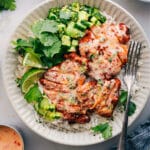 Note 1: A fresh cucumber-avocado salad takes this dish to the next level! If you don't want to make a whole separate salad, try this: Toss together 1 ripe diced avocado with 1-1/4 cup diced English cucumber. Drizzle in a touch of honey, olive oil, and lime juice plus a pinch of salt and pepper.Storage: Cooked chicken is best fresh but keeps in the fridge for 3 days. Reheat in the air fryer. Store coated (uncooked) chicken in the fridge and air fry within 24 hours. Keep the sauce in the fridge for 5 days and stir before using.Nutrition: Nutrition facts include the chicken and bang bang sauce only. Calories for rice and toppings will vary.