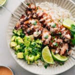 Divide the cooked rice evenly among 4 bowls. Top each bowl with chicken skewers and cucumber salad (if using). Drizzle or brush sauce over the chicken and serve promptly.