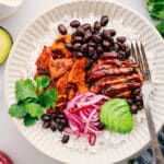 Storage: Store chicken and BBQ sauce together in the fridge for up to 3 days. Keep sweet potatoes and rice in separate containers for the same timeframe. Dressing lasts up to 5 days in a jar in the fridge. Slice avocado fresh before serving, and pickled onions stay good for up to 2 weeks. Reheat components and assemble fresh for the best flavor.