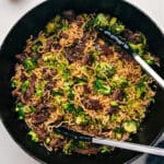 In the same pan, add the beef broth, brown sugar, soy sauce, sesame oil, oyster sauce, garlic, and ginger. Stir and scrape up any browned bits from the bottom of the pan. Cook over high heat, uncovered, until the sauce boils and thickens slightly; this takes about 5–8 minutes. Make sure there’s enough sauce to coat the noodles and broccoli. See note 3.