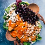 Add lettuce to a large bowl or platter. Top with the diced cooled beets, citrus, sliced and candied almonds, and goat cheese (see note 2). Drizzle dressing on to your preference; you may not want it all (I use about 3/4 of it. Leftover dressing stays good for up to a week in the fridge and is great on veggies/other salads.) Gently toss to combine, taste for any additional seasoning or if you want to add more dressing, and enjoy immediately.
