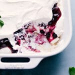 Spread 1/2 of the cake mixture along the bottom of a trifle dish or 9x13-inch pan. Top with 1/2 of the blueberry pie filling. Smooth 1/2 of the whipped cream on top. Don’t worry about it looking perfect or pretty, it will be a bit messy!