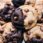 Stir in the cornstarch, baking powder, baking soda, and salt until well combined. Add the flour and mix just until incorporated. Finally, fold in the mini and regular chocolate chips. Cover the bowl tightly and refrigerate for 25 minutes.