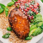 Note 1: Finely grate a block of Parmesan right over plates with a microplane for the best texture.Note 2: For stovetop: Heat 1 tbsp oil in a large nonstick skillet over high heat. Let excess marinade drip off, then cook chicken 2–4 mins per side until done. Remove from skillet and brush with reserved marinade.Storage: Store leftovers in airtight containers in the fridge for 3-5 days. Keep the chicken, bruschetta, and quinoa separate. Add avocado just before serving.