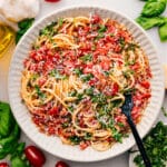 Note 1: The better the tomatoes, the better the flavor. Use ripe cherry tomatoes and dice them small—cherry tomatoes are usually sweeter and juicier than grape.Note 2: Use a block of Parmesan and grate it on the small holes of a box grater. Lightly pack into a 1/2 cup for best results.Storage: Store in an airtight container in the fridge for up to 3 days. Enjoy cold like a pasta salad or reheat with a splash of olive oil. Add crispy topping just before serving.
