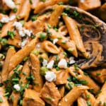 Note 1: I don’t typically like jarred Alfredo, but Rao’s ®Alfredo is pretty great—the freshest tasting jarred Alfredo I’ve ever tried—creamy, smooth, and rich. If you don’t use Rao’s, be sure to use a good quality one that you love! (With so few ingredients, the ingredients used really matter!)Note 2: Frank’s® RedHot Wings Buffalo sauce is what we’re looking for here! Frank’s makes quite a few sauces; be sure to use the one labeled “buffalo,” not the cayenne pepper sauce!Storage: As with most pasta recipes, this dish is best enjoyed the minute everything is tossed together. Because of the pasta and dairy, I wouldn’t recommend freezing Buffalo Chicken Pasta. Dishes with dairy typically get grainy, or the sauce can break/curdle from being frozen and thawed.